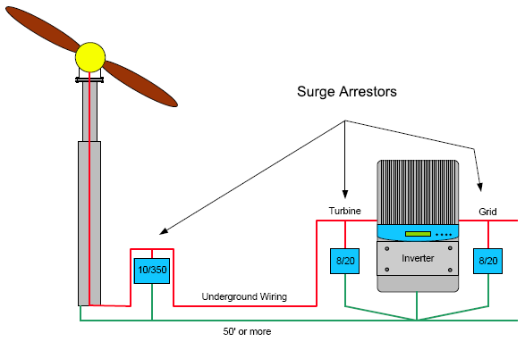 It should be clear from the above that there is no single ideal surge arrestor device. That means a combination of devices needs to be employed to provide effective lighting arresting. A divide and conquer strategy. By dividing responsibilities we can also put a little redundancy into the system; when one device fails it does not immediately leave the entire system vulnerable. For a typical wind turbine install this means there should be a lightning arrestor close to the wind turbine alternator, to protect the alternator and slip-rings, and to take as much energy as possible off the turbine wires before they go to the inverter or charge controller (or batteries). Since the turbine is very much exposed to the elements and can get hit by a direct strike this requires a 10/350 rated device. Hopefully the turbine wiring goes underground for some distance from there (50 feet or more), adding enough inductance to the system to decouple from the direct lightning current and turn the left-over surge into something that resembles more of an 8/20 waveform. Therefore, directly before the electronics (rectifier, inverter, charge controller, or batteries) an 8/20 rated surge arrestor is a good choice. The other side of the electronics, the grid side, needs protecting too. If this is not exposed to direct strikes an 8/20 device is all it takes here. For locations with overhead grid lines prone to direct strikes it takes another 10/350 device, and a subsequent 8/20 arrestor down the line (or a combination device) to properly protect this. In case there are any additional wires coming or going to the electronics, such as Internet, phone, or DC from photovoltaics, they will need surge protection too. It only takes a single unprotected line to bring in a surge that will do thousands of dollars in damage.
