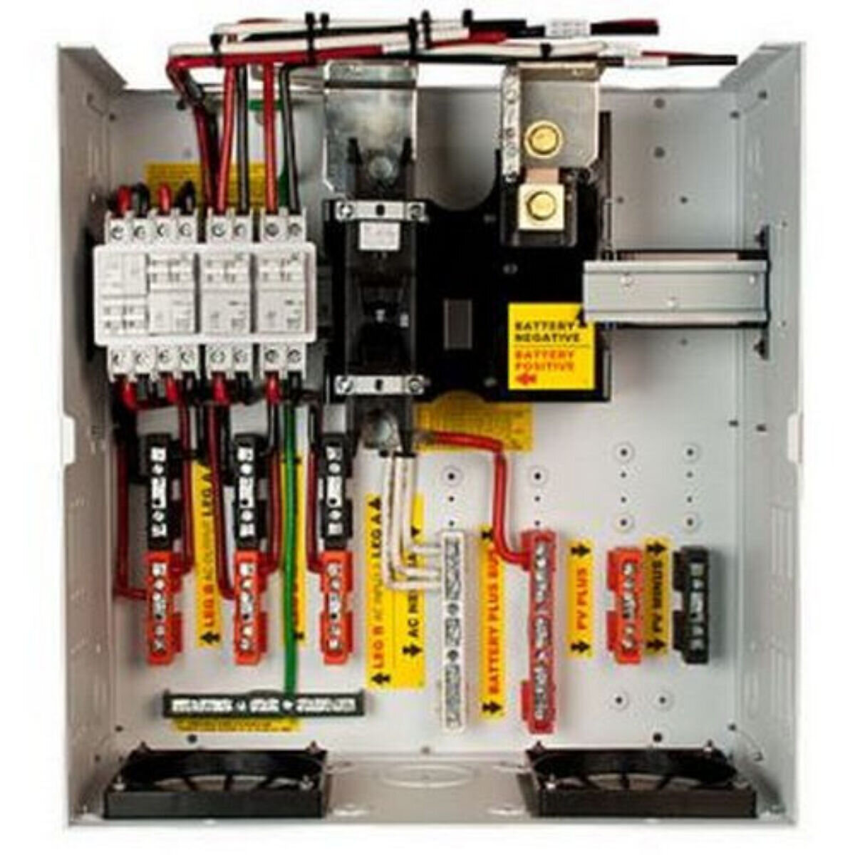 - Massive tin plated copper bus bars directly connect to the XW’s battery terminals